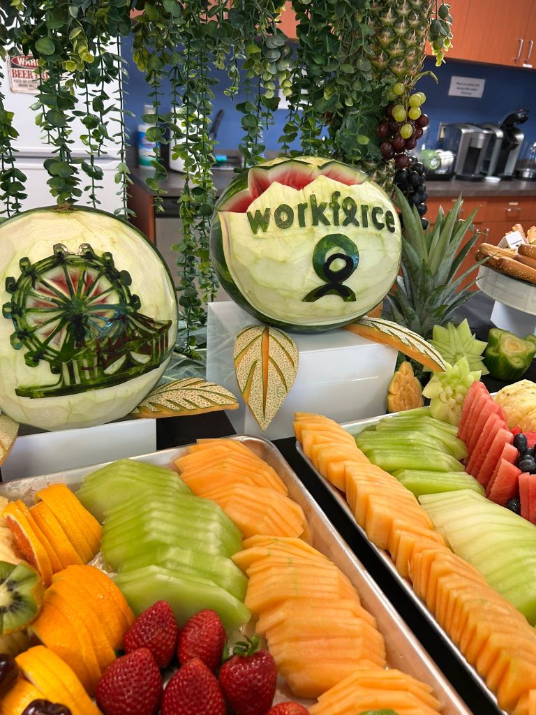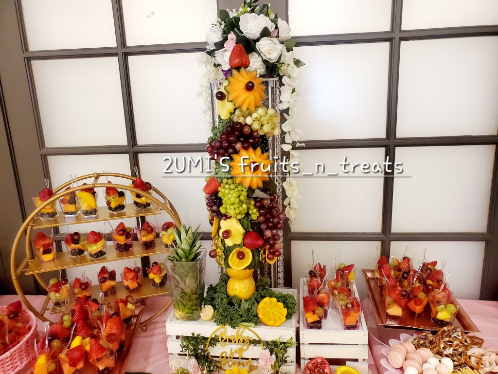 Fruit Island setup includes fruit cups, treats and fruit grazing. Add-on option of cheese and meats grazing available. Minimum 25 guests.